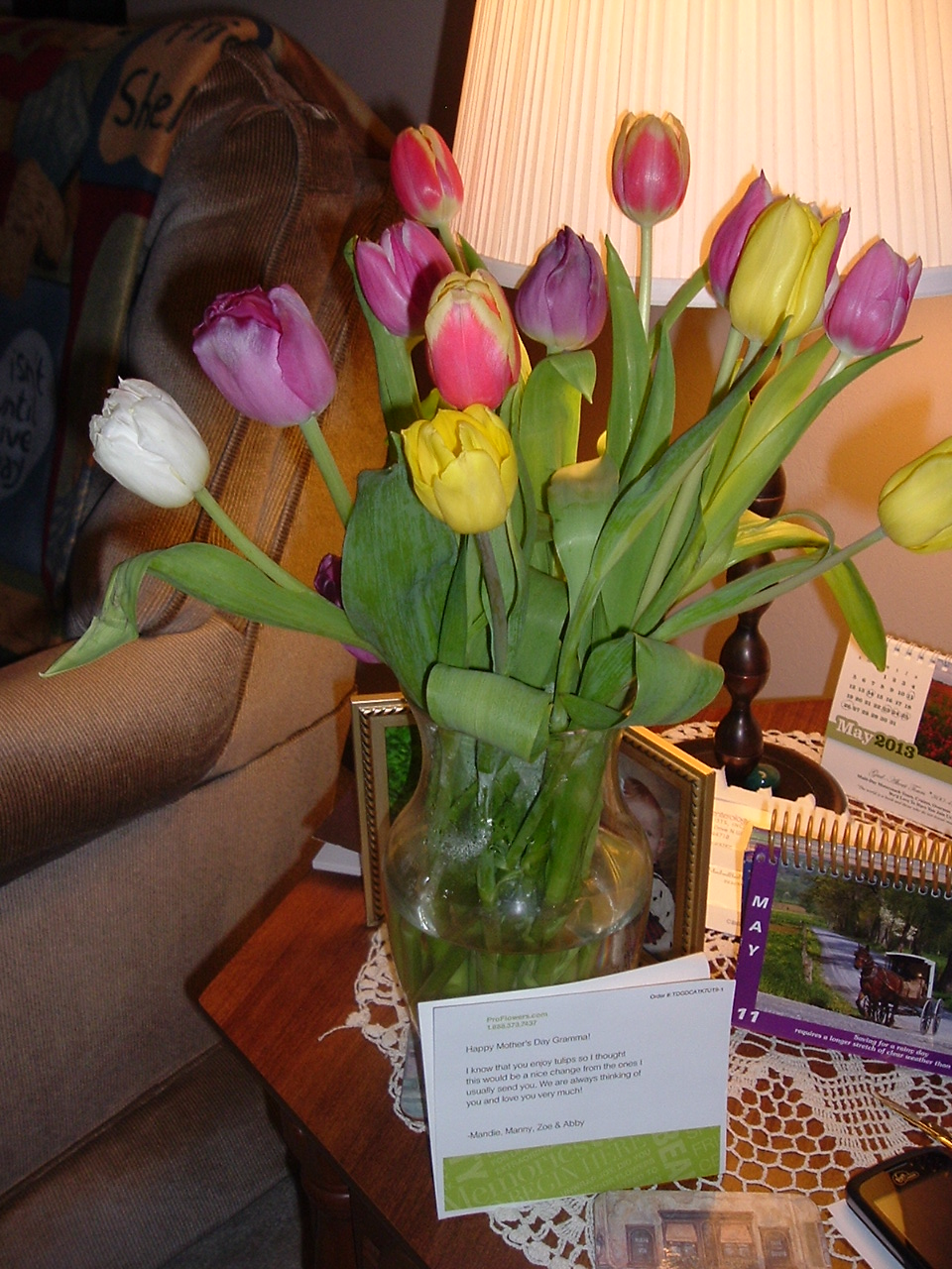 Mandie, Manny, Zoe and Abby sent me tulips for Mother's Day. Today Bill brought me flowers and